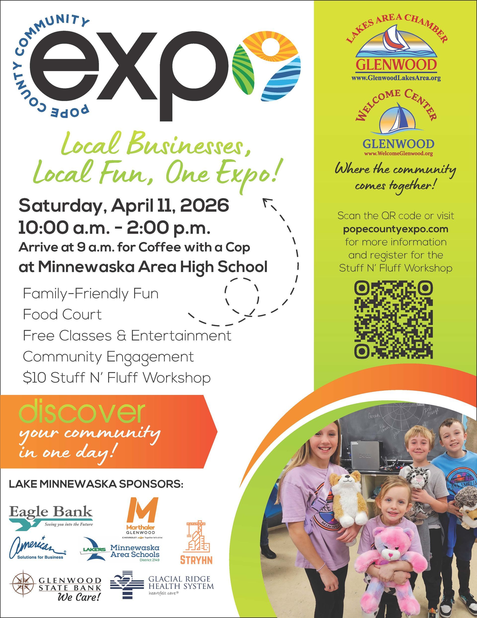 11:00 am Stuff N’ Fluff Experience 2* – Classroom E161 * $10 cost and pre-registration is required. Visit GlenwoodLakesArea.org/Expo before April 11, or at the Welcome Table the day of the event. Register here: https://mms.glenwoodlakesarea.org/members/evr/reg_main.php?orgcode=GLAC&evid=101065189